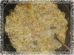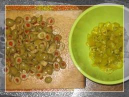 Benütigt wird 200g Oliven, 200g Peperoni -nicht die scharfen-, ne Zwiebel, !50g Frischkäse, evtl. Paniermehl, Blätterteig & Gewürze
