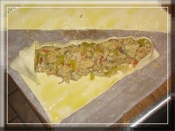 die Zwiebel in ganz dünnen Scheiben andünsten, Peperonis und Olive in Scheiben schnibbeln und dann zu den Zwiebelscheiben, jetzt würzen, richtig würzen (ich würze mit Honig, saft 1/2 Limette, Sojaöl, Chili, Pfeffer, Paprika und ganz kleingehacktem Ingwer), haut ruhig rein, die Schärfe wird beim Backen reduziert. Dann den Frischkse zugeben und wenns zu flüssig wird mit Paniermehl eindicken. Den Blätterteig ausrollen und in Streifen oder 3ecke schneiden. Mit Olivenölbestreichen, Pampe rein und zuwickeln. Die Kalorienbewussten streuen Gewürze drüber, die keine kcal zählen, reiben Käse drüber. Ab in den vorgeheizten Backofen.